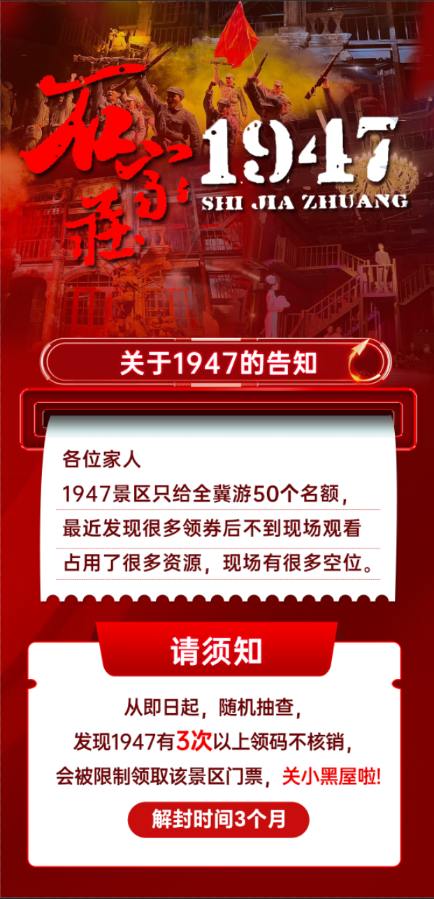 从即日起,随机抽查,发现【1947景区】和【热雪奇迹景区】有3次